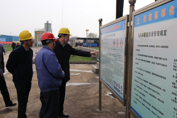 3月23日上午,淮南市委常委、副市長楊東坡一行蒞臨安徽德邦公司檢查安全生產工作。市經濟技術開發區管委會主任張海濤,市應急管理局局長李寶云等省市安全專家一起陪同檢查。楊市長一行在公司領導的陪同下分別來到液氨貯槽和甲醇罐區實地查看安全生產運行情況,要求企業認真汲取江蘇省鹽城市響水縣天嘉宜化工有限公司“3•21”爆炸事故教訓,全面排查治理安全隱患,嚴格落實安全生產責任制,開展全員安全警示教育,扎實做好當前化工和危險化學品安全生產工作,嚴防各類事故的發生。